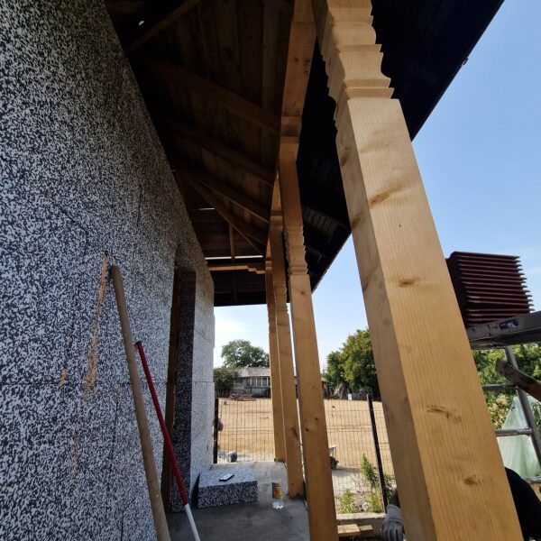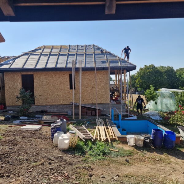 Casa cu structura de lemn. Pereti din osb cu izolatie exterioara termosistem dalmatina, izolatie interioara cu vata bazaltica.